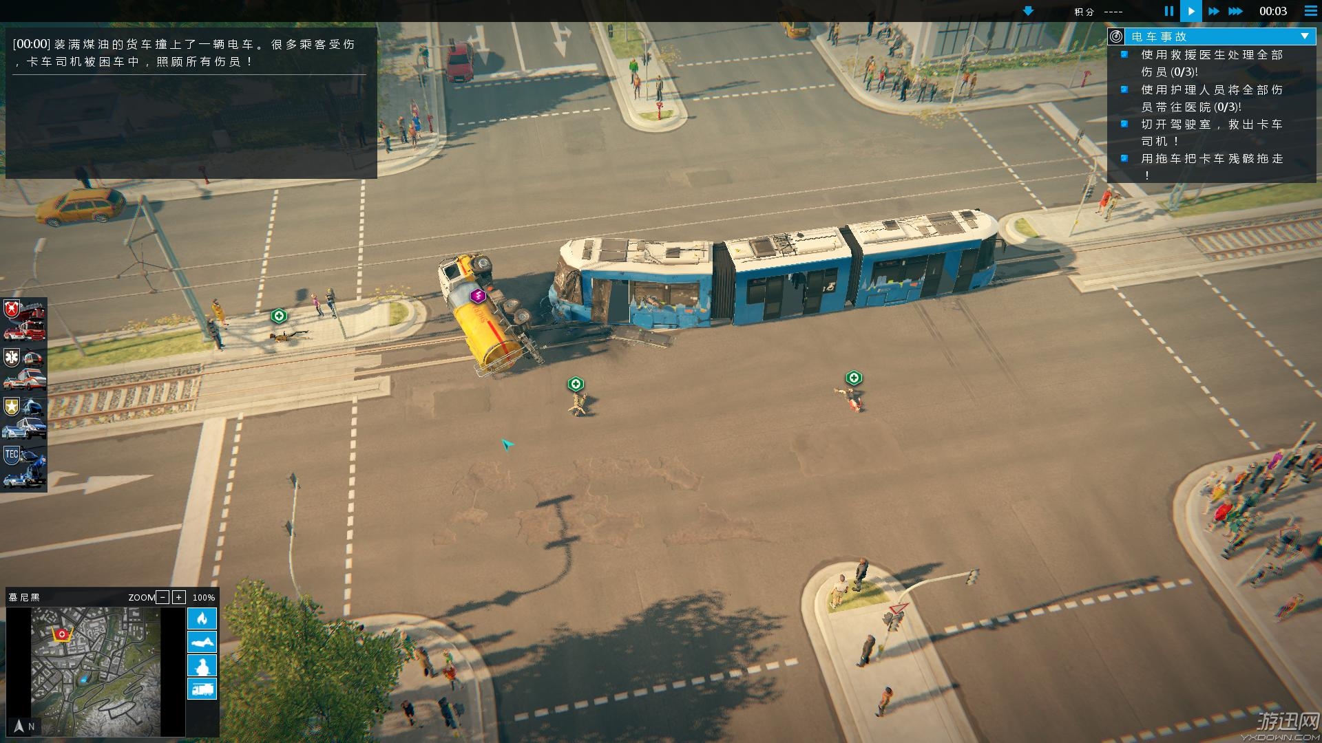 四个部门分别可以派出救火车、医疗车、警车与拖车,车辆出动需要一定的时间,玩家应该充分了解灾情的轻重缓急,合理安排车辆,如火势很大时优先派出消防车,而人员伤情严重时救护车也要尽快出动。