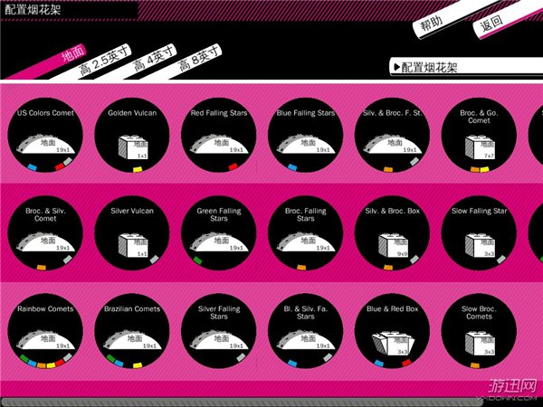 烟花配置器:玩家可以自由配置烟花,从烟花架的类型和烟花的种类进行选择,选择完后可以进行保存,在表演过程中就可以使用到自制的烟花架。