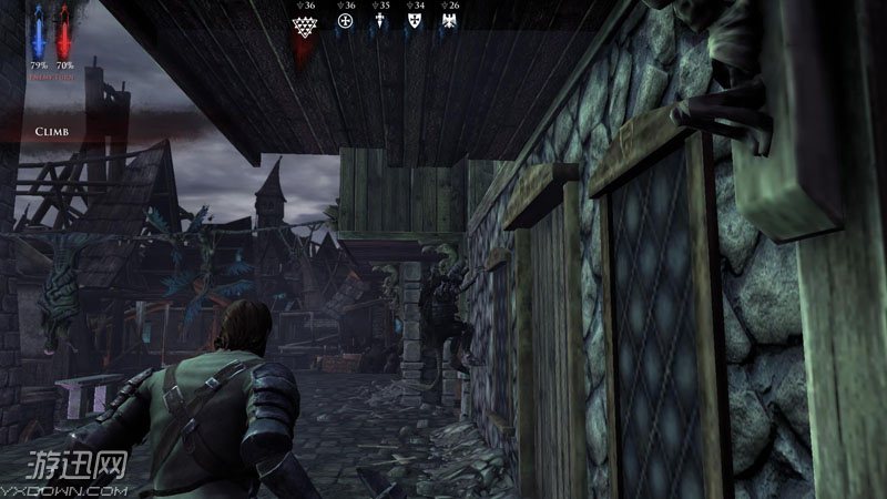 游戏特色复杂的战场环境,破败的城镇中很多地方都可以攀爬,还有大量的隐藏角落。