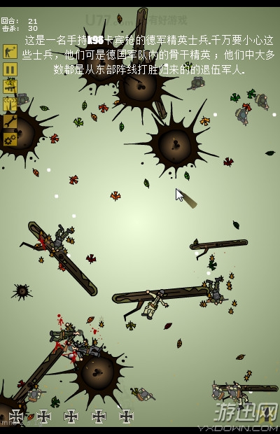 《鲜血染红的大地2》是一款塔防策略类游戏,游戏背景设定在二战时期,游戏中玩家扮演的盟军将士在前线阻止纳粹大军的侵袭。在本作中,游戏似乎没有终点,全看玩家能够在这激烈的炮火中坚持多久,感兴趣的玩家快来试试能存活多少时间吧! 游戏画面一般,但是耐玩度很高,敌兵的组合是随机生成,并且内容相当丰富,各种兵种以及设施提供给玩家使用。 游戏中你可以点击一名士兵移动到你想去的地点,士兵的战斗是自动进行,敌人一旦进入我方士兵的视野就会发动攻击。在战斗时玩家需要做的就是控制士兵的移动和寻求援兵等操作,这些操作都是需要消耗战术点的,不过战术点增长缓慢,需要合理运用。 呼叫援兵:玩家可以在队伍菜单进行选择,用战术点来召唤士兵和坦克等。 命令的决定:可以改变战斗方面的属性能力,如回血、指定目标攻击等,不过你的队伍中必须有军官。 物流订单:为你的士兵和坦克装备更加强大的武器。 无线支援:你可以使用收音机菜单并调用空中打击和远程火炮支援,需要队伍中拥有通讯兵。 建筑物:可以在战场上建立各类防御工事来抵御敌人的袭击,需要队伍中拥有工程师。 《鲜血染红的大地2》拥有相当的难度,敌人的攻击强度远远大于我们的抵抗力度,战术点总感觉是不够的。而且由于敌军是随机出兵,可能玩家一上来就遭遇高强度的袭击,而且伴随着诸多不平等事件,你新召唤的单位可能还没发挥作用就被干了。